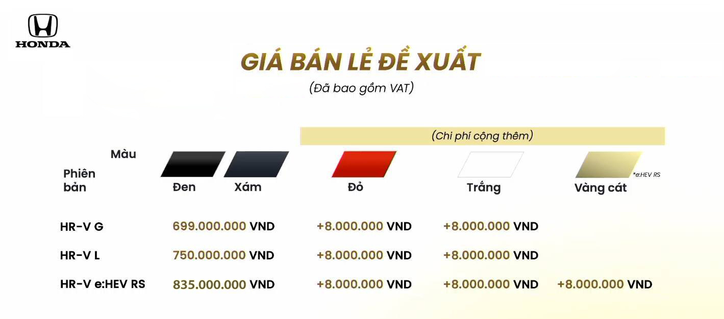 | HR-V RS e:HEV | 869.000.000 | 1.009.000.000 | 989.000.000 | 989.000.000 | 989.000.000 |